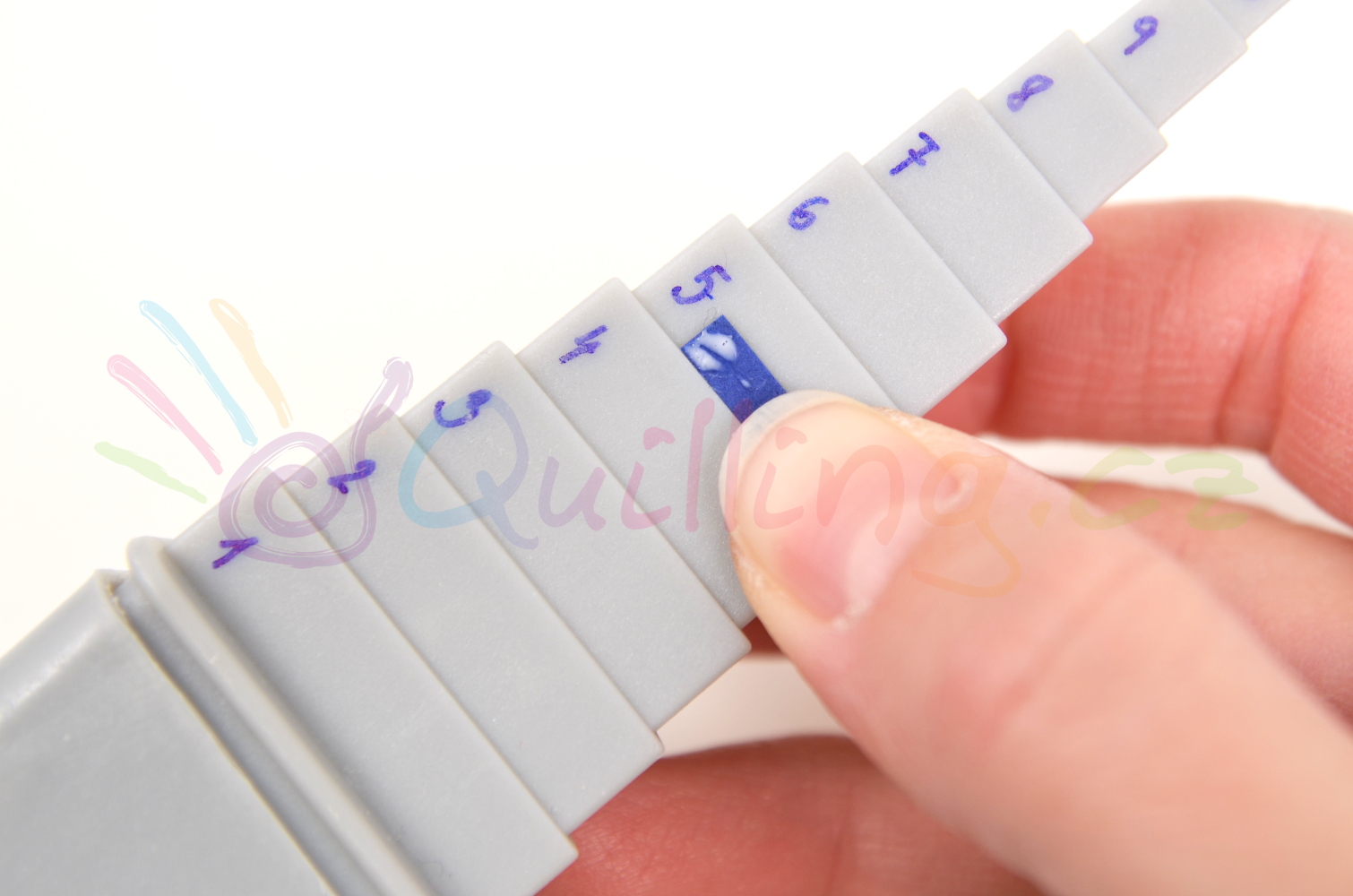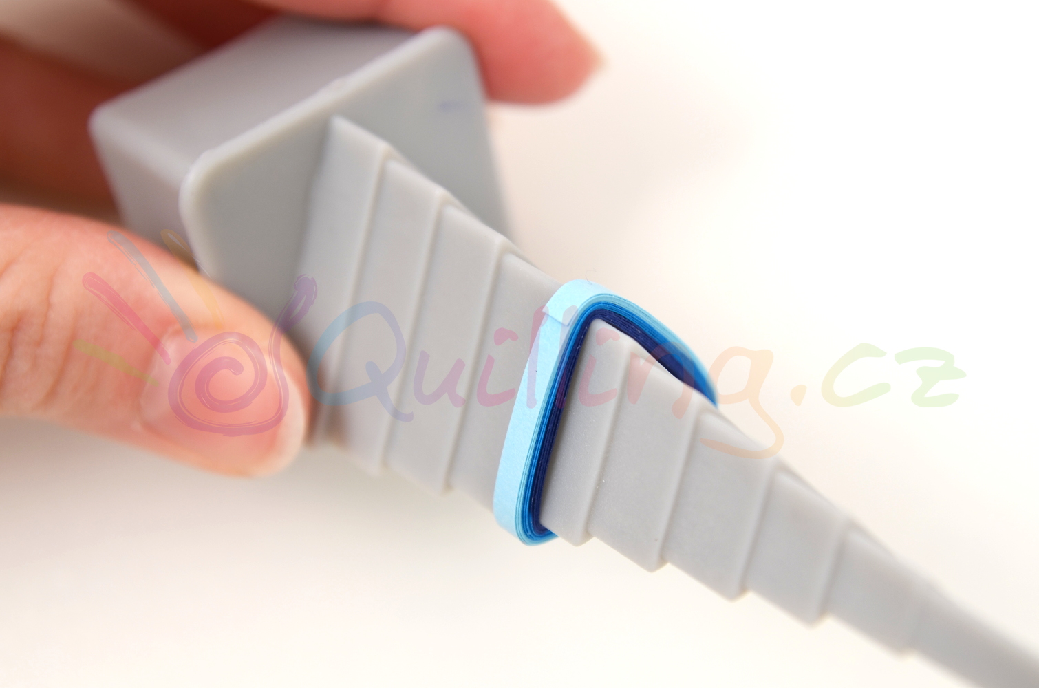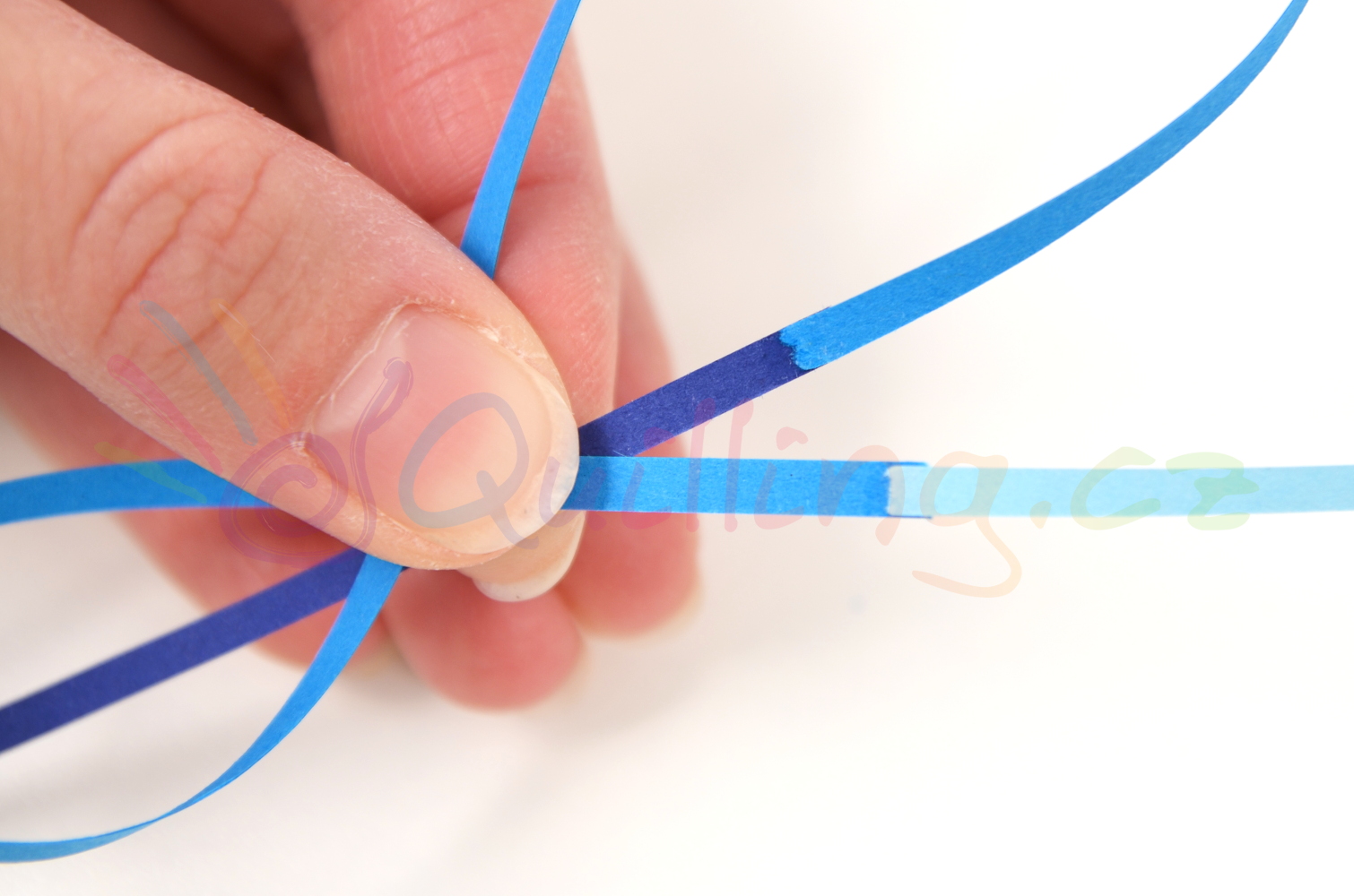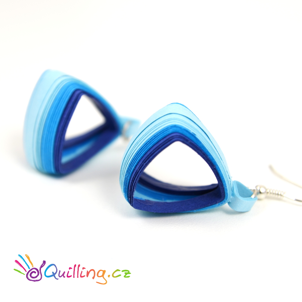 Spojte v jeden dlouhý proužek tyto tři proužky: světle modrý, modrý a tmavě modrý. Udělejte to ještě jednou, ať jsou barevné proužky dva, protože jedna náušnice je spojená ze dvou dílů. Obmotejte jeden spojovaný barevný proužek kolem pátého patra quillingové trojúhelníkové věže.