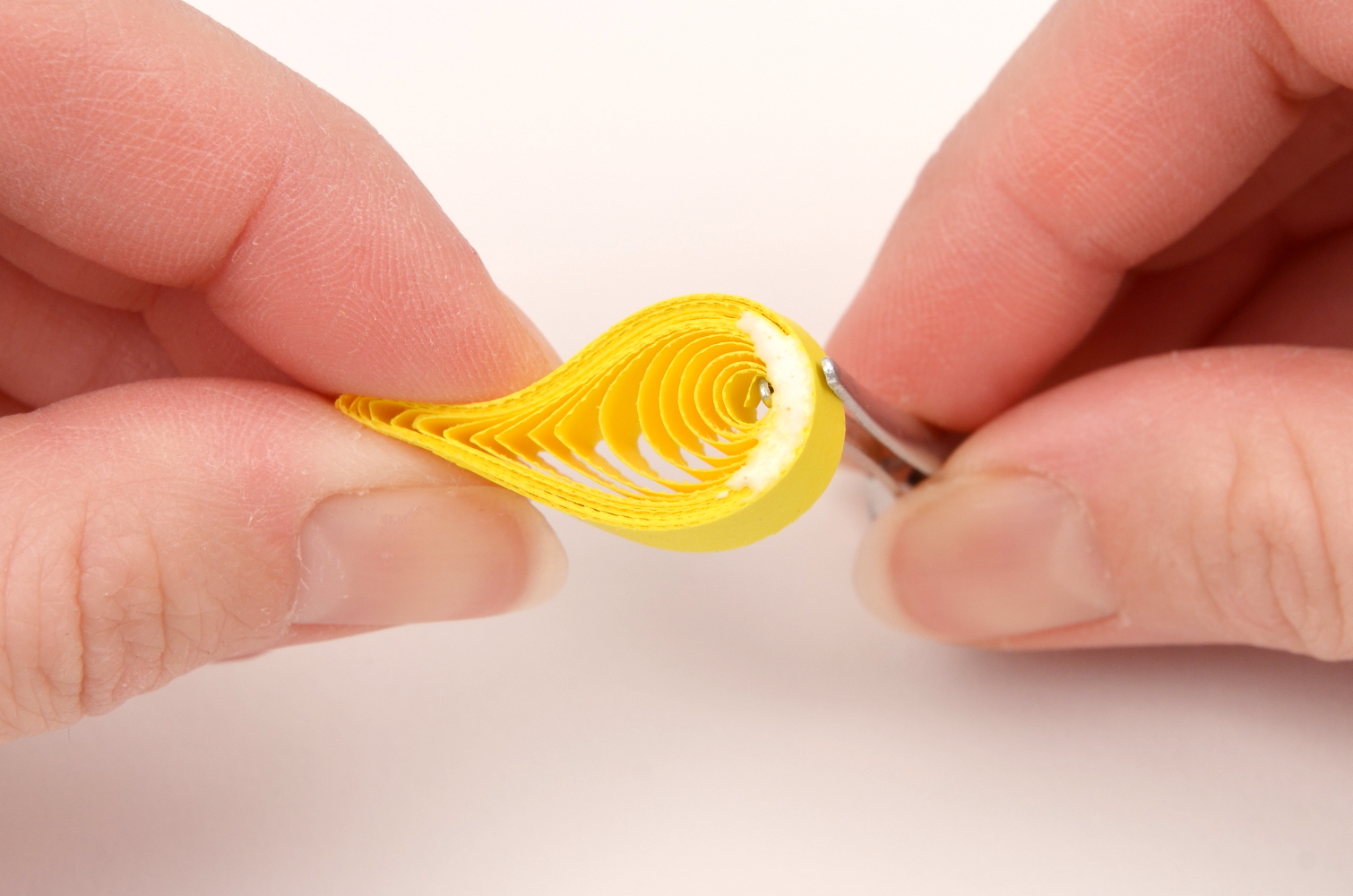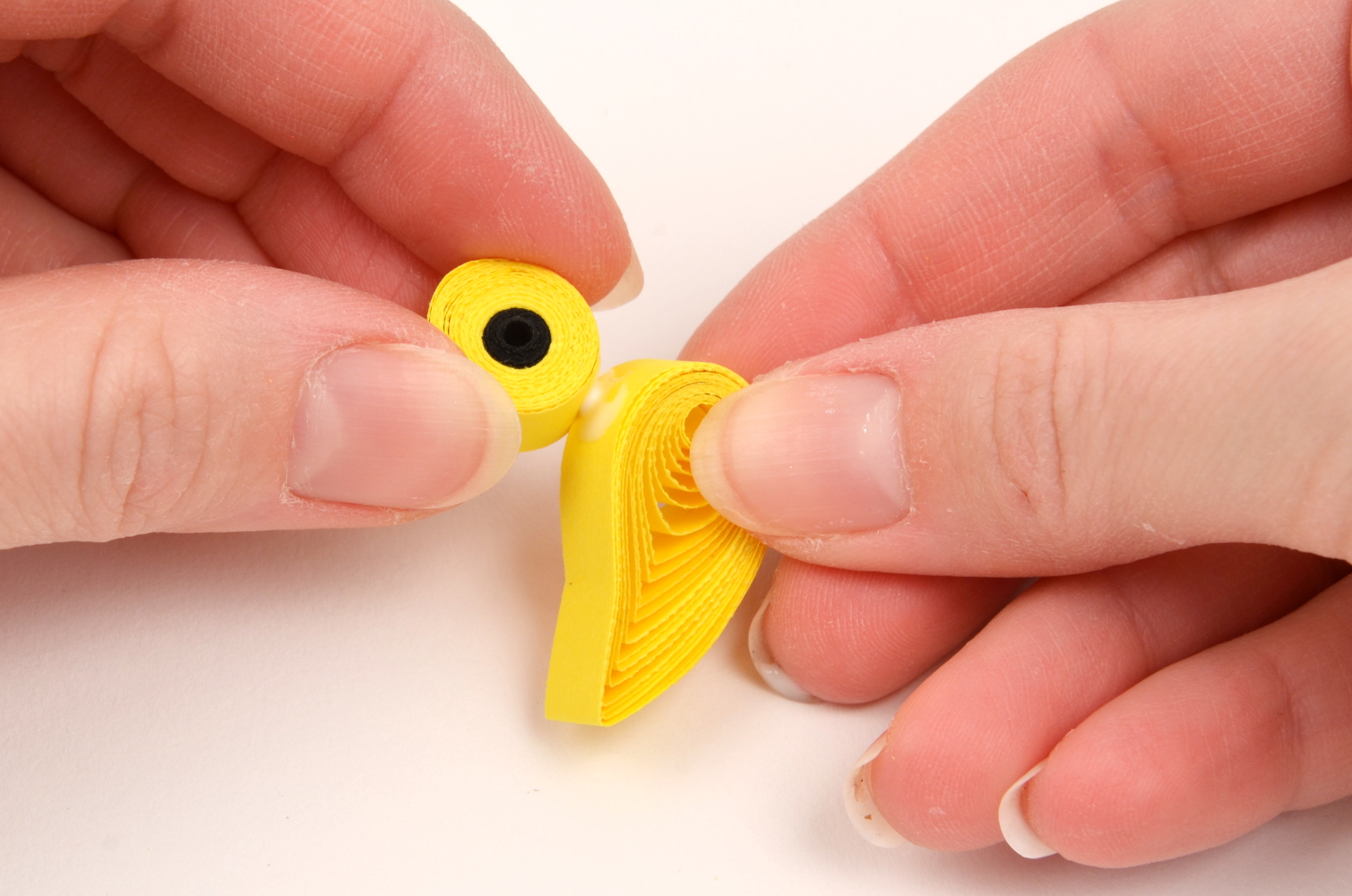 Tělíčko kuřátka je z quillingového tvaru, který se nazývá kapka. Spojíme si konci tři žluté proužky (7) a natočíme je na quillingový kolík. Vzniklou spirálku sundáme z kolíku, vložíme do otvoru kružnicové šablony (velikosti cca 2 cm), kde se volně rozvine. Nyní koneček spirálky přilepíme. Pomocí pinetky přitáhneme střed spirálky ke straně a spoj potřeme lepidlem (až zprůhlední, můžeme pinetku sundat). Na jedné straně tvar zmáčkneme do špičky (ocásek kuřátka). Hlavičku a tělíčko přilepíme k sobě.